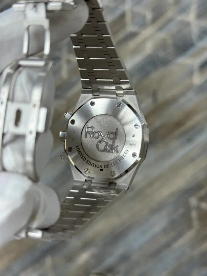 Black dial with “Grande Tapisserie” pattern, grey blue counters, white gold applied hour-markers and Royal Oak hands with luminescent coating.