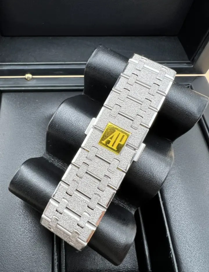 Plum purple dial with “Grande Tapisserie” pattern, rhodium-toned counters, white gold applied hour-markers and Royal Oak hands with luminescent coating.