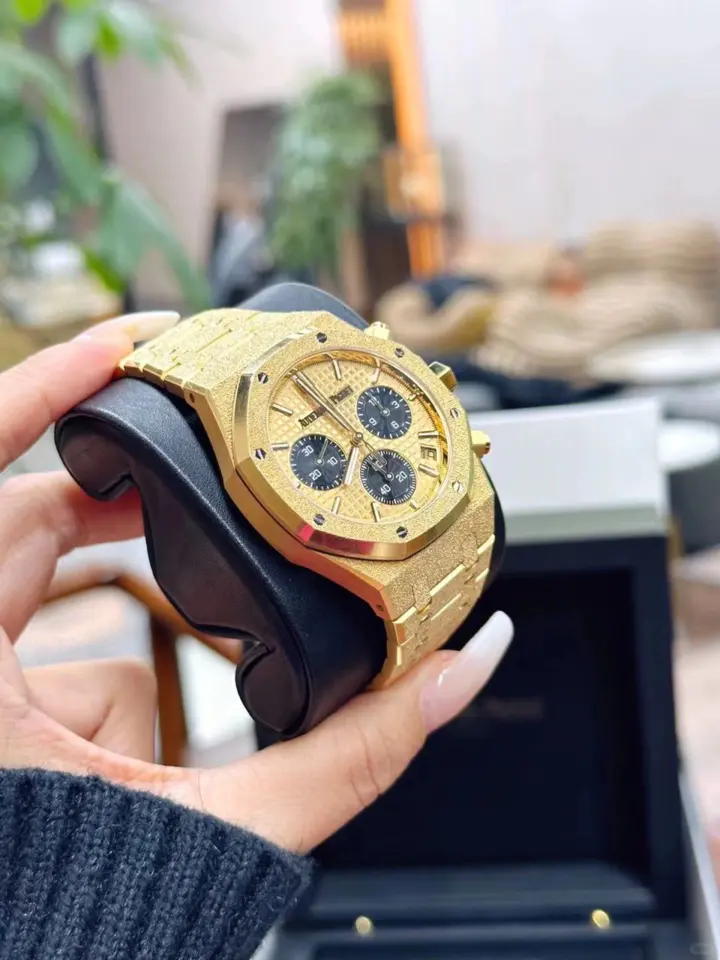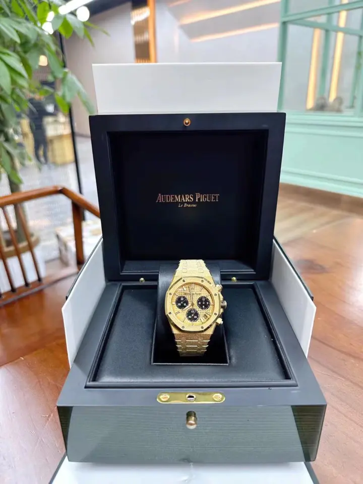 Yellow gold-toned dial with “Grande Tapisserie” pattern, black counters, yellow gold applied hour-markers and Royal Oak hands with luminescent coating.