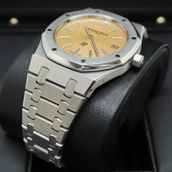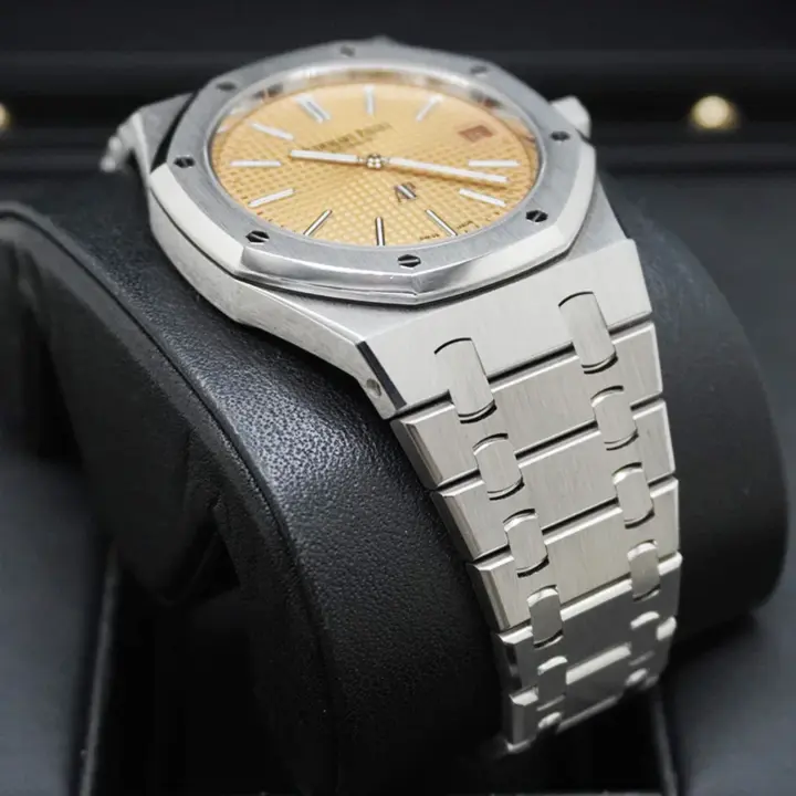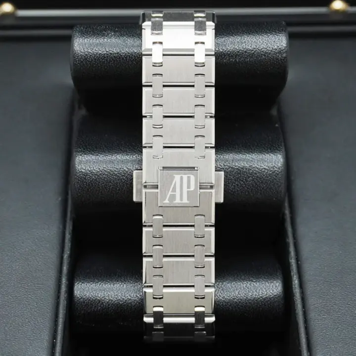 Pink gold-toned dial with “Petite Tapisserie” pattern, white gold applied hour-markers and Royal Oak hands with luminescent coating.