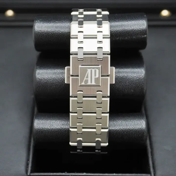 Light blue dial with “Grande Tapisserie” pattern, baguette-cut diamond hour-markers and white gold Royal Oak hands with luminescent coating.
