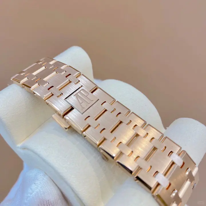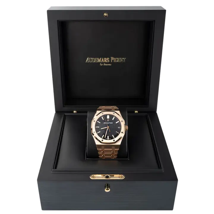 Black dial with “Grande Tapisserie” pattern, pink gold applied hour-markers and Royal Oak hands with luminescent coating.