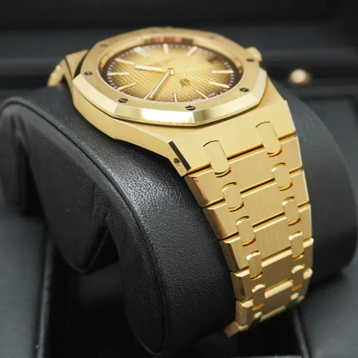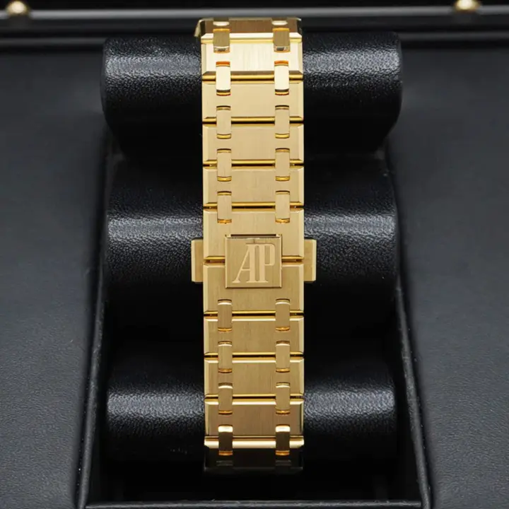 Smoked yellow gold-toned dial with “Petite Tapisserie” pattern, yellow gold applied hour-markers and Royal Oak hands with luminescent coating.
